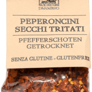 Reiner getrockneter Chili-Pfeffer zerstampft und unter Schutzatmosphäre abgepackt – sapore piccante alla italiana lässt grüßen! Zutaten: Pfefferschoten getrocknet. Glutenfrei. Trocken lagern. Abgepackt in Italien unter Schutzatmosphäre. Durchschnittliche Nährwertangaben für 100g: Brennwert: 166kJ/40kcal Fett: 0,4g davon gesättigte Fettsäuren: 0g Kohlenhydrate: 8,8g davon Zucker: 0g Ballaststoffe: 1,5g Eiweiß: 1,8g Salz: 0g.