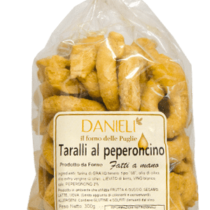 Traditionelle Taralli aus einem kleinen handwerklichen Betrieb in Apulien frisch zubereitet. Frei von Konservierungs- und Farbstoffen sind diese Taralli mit Chili von hoher QUalität und frischer Zubereitung. Dank der speziellen Zubereitungsmethode gelingt es der Bäckerei Danieli knackige, knusprige Taralli zu bereiten, die weder am Gaumen, noch an den Zähnen kleben. Das Besondere: seit jeher Kochen die Bäckermeister bei ‘Il Forno delle Puglie – Danieli’ die frischen und rohen Taralli kurz in siedendem Wasser. Der Teig wird außen kross und kann dann im Backofen von innen garen. Einzigartig knusprige Taralli mit viel Geschmack sind das Ergebnis! Zutaten: Weichweizenmehl Typ 00, Olivenöl, Olivenöl extra vergine, Bier HEFE, Weißwein, Salz, 2% Chilipfeffer. Produziert in einer Umgebung, in der NÜSSE, SESAM, MILCH, EIER verwendet werden. Enthält GLUTEN und SULFITE aus Wein. Durchschnittliche Nährwertangaben für 100g: Energie: 1928,24 Kj/ 458,53 Kcal Fette: 15,87g davon gesättigte Fette: 2,40g Kohlenhydrate: 68,42g davon Zucker: 2,20g Eiweiß: 9,83g Sodium: 0,86g Salz: 2,18g.