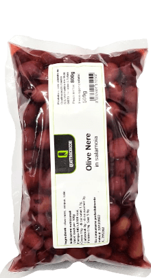 Diese Olive Nere sind schwarze Oliven. Sie sind von bester Qualität direkt produziert und abgepackt von Quattrociocchi in der Region Lazium. Noch bissfest und lediglich in Salzlake eingelegt sind sie ideal als Aperitif und für Salate nach mediterraner Art. Der Stein ist noch enthalten, somit sind es sehr aromatishe schwarze Oliven. Geben Sie sie in Nudeln, auf die Pizza oder in Salate jeglicher Art. Der Dolce-Vita-Geschmack ist garantiert. Verpackt im bequem zu verwendenden Beutel. Zutaten: grüne riesige Oliven (Olive verdi giganti), Wasser, Salz. Abtropfgewicht 500g. Nettogewicht: 800g. Durchschnittliche Nährwertangaben für 100g: Brennwert: 446kJ/108kcal Fett: 11g davon gesättigte Fettsäuren: 1,7g Kohlenhydrate: 0g davon Zucker: 0g Eiweiß: 0,9g Salz: 5,6g.