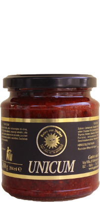 Zutaten: getrocknete Tomaten 46% (Sulfite), Sonnenblumenöl, Radicchio dell´orso, Olivenöl extra vergine, wilder Spargel, Knoblauch, Chili, Thymian, wilde Minze, natürliche Aromen, Zucker: (Dextrose, Fructose), Antioxidans: L-Ascorbinsäure, Geschmacksverstärker: Mononatriumglutamat.