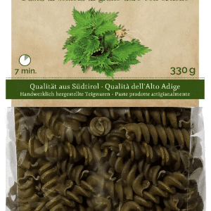 Ingredienti: semola di GRANO duro, acqua, ortiche 2% e menta in polvere. (*non dell’Alto Adige). Contiene GLUTINE. Paese di coltivazione del grano: Italia. Paese di molitura: Italia. Tempo di cottura: 7 minuti. Conservare in luogo fresco e asciutto. Valori nutrizionali medi per 100g: Energia: 1504kJ/355kcal Grassi: 1g di cui saturi: 0,2g Carboidrati: 73g di cui zuccheri: 4,1g Fibre: 2,8g Proteine: 12g Sale: 0,1g.